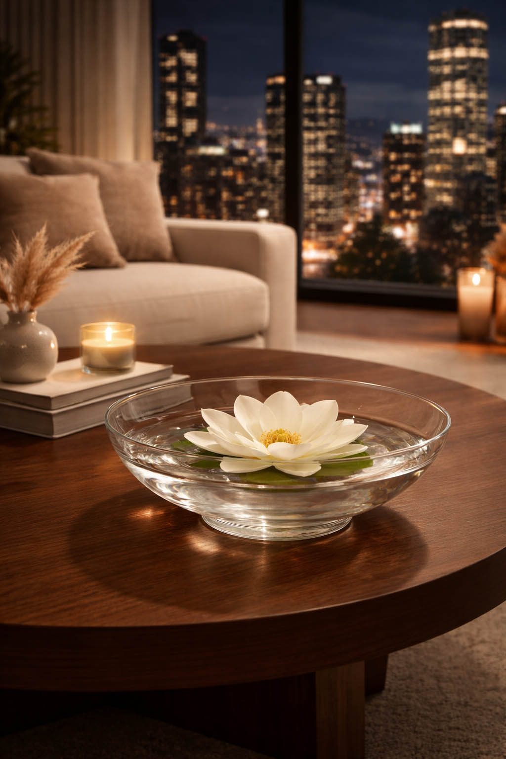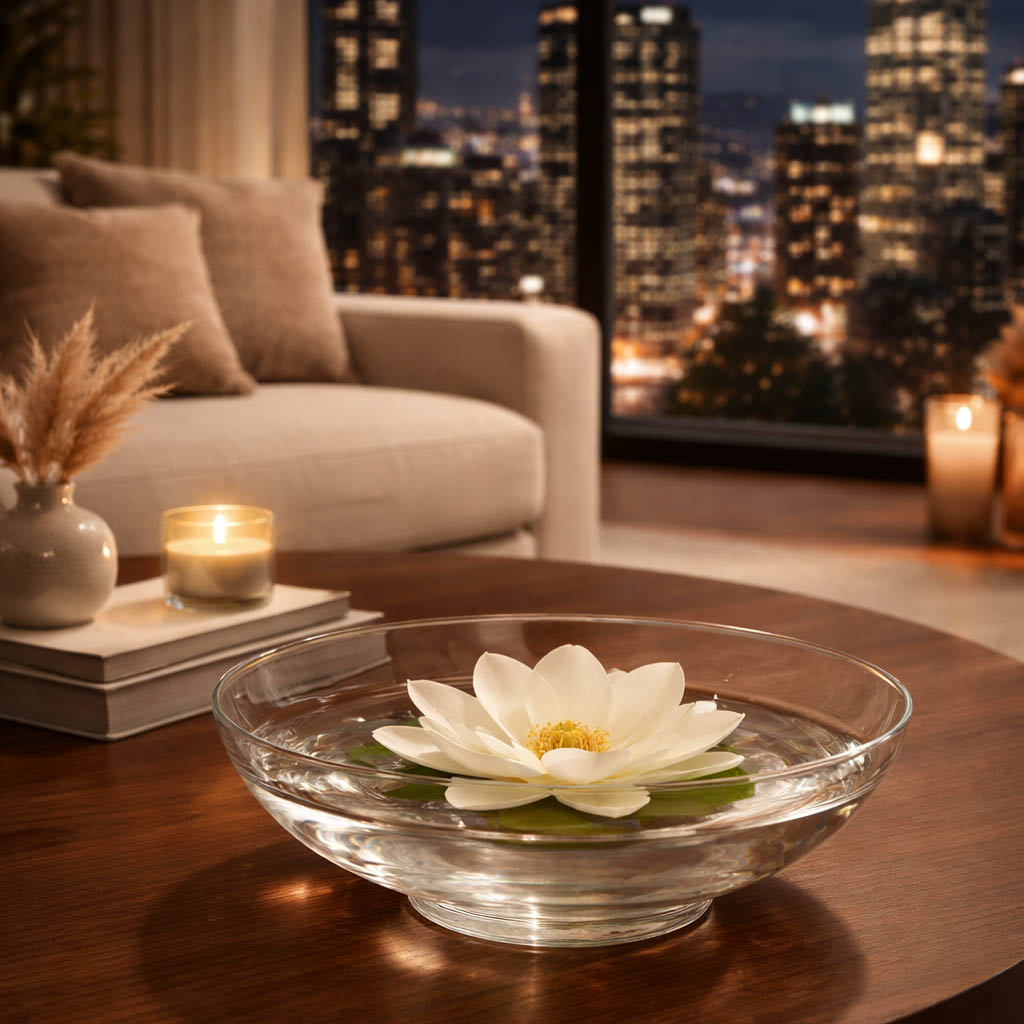 Centro de mesa en cristal, diseño circular con un pequeño pie cilíndrico.